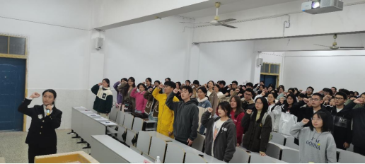 大会的最后环节是集体宣誓,由何雨霏同学担任领誓人。在何雨霏同学的带领下,全体学生庄严宣誓,表达了他们对四级考试的重视和决心。宣誓活动不仅增强了学生们的责任感和使命感,也为即将到来的四级考试注入了强大的动力。