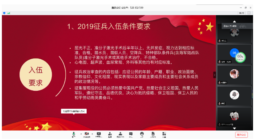 (通讯员 黎璐)为鼓励学生积极参与应征入伍,提高兵员征集质量,推进国防和军队现代化建设,必赢官网于5月15日晚七时举行了“2020年征兵宣讲线上会议”,特邀韩王戴贤和邓书雨两位退伍军人为与会成员进行宣讲。必赢官网征兵专干严星老师、各班班干及有参军意向的全体同学参与本次会议,会议由周锦主持。