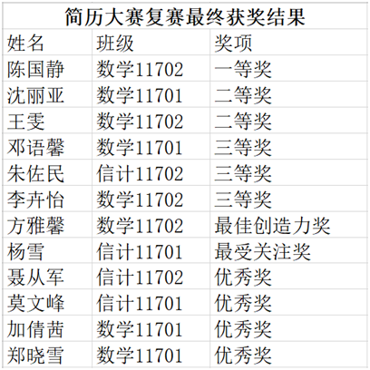 经过层层筛选,经过内容、创意、格式、个人风采展等各方面综合考评,最终确定以下同学荣获本次简历制作大赛佳绩,希望获奖同学能够继续努力,与奖项失之交臂的同学也再接再厉。