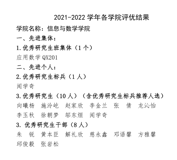 为了树立先进典型,充分发挥典型的教育示范作用,学校研工部决定,评比和表彰一批先进集体、先进个人。经过个人申报,民主评议,院学生事务办公室推荐,学院评审小组审核,现将2021-2022学年研究生工作先进集体和个人评选结果予以公示,具体名单详见附件。 公示时间为:2022年11月29日—12月1日。公示期间,凡对上述评选有意见者,请及时以书面或口头形式向分管学生工作的领导反映。 联系人:袁海山 联系电话:0716-8060378 必赢3003no1线路检测中心学生事务办公室 2022年11月29日