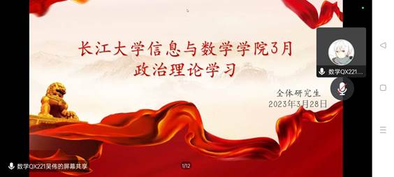 (通讯员 陈伟 刘丽/摄 张天龙)为培养全院研究生的政治理论修养和履行好党和人民赋予的新时代职责使命。 3月28日,必赢3003no1线路检测中心在腾讯会议召开3月政治理论学习会议,此次会议吴伟主持,全体研究生线上聆听。