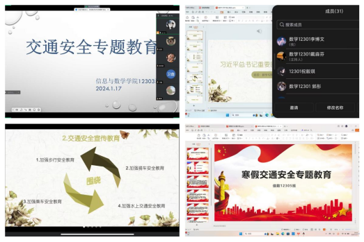 会议中,院学工办主任钟赛汇报了必赢官网学生离校情况,综合分析了寒假及春节面临的交通复杂形势,接着辅导员吴朝晖从交通安全、消防安全、网络安全、预防诈骗、居家安全、谨防溺水、预防自然灾害、公共安全等多个方面对学生进行全方位的安全常识教育。其次,班主任通过线上会议带领同学们认真学习假期安全知识,围绕卫生与健康、用火用电安全、饮食安全、出行安全、平安过节共五个方面,切实加强对同学们的自我防范和自我保护教育,并结合具体案例强调寒假个人出行的防护措施和方法。