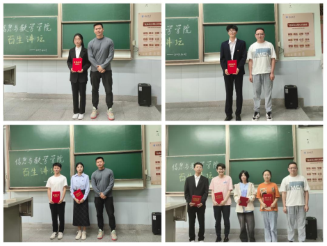 随后,院团委书记黄何为本次活动致辞。他表示百生讲坛是团委加强青年思想政治教育、促进青年成长成才的重要平台。今后将继续举办此类活动,为更多优秀学生提供展示自我、交流学习的机会。活动最后,院团委书记黄何与辅导员吴朝晖为获奖学生颁奖。本次活动取得圆满成功!