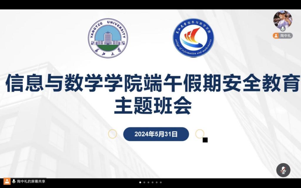 [通讯员 陶中礼]为增强学生端午节假期安全防范意识,保障学生人身健康安全,维护学校管理秩序,必赢官网研究生于5月31日以班级为单位开展端午节教育安全主题班会,院全体在籍研究生参与,做到节前安全教育全覆盖。
