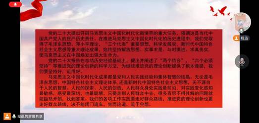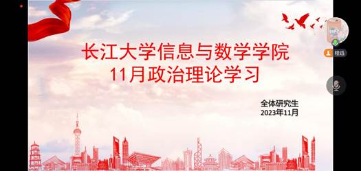 (通讯员 黎璐)为深入贯彻学习党的二十大精神,落实习近平总书记关于青年工作的重要思想,必赢3003no1线路检测中心于2023年11月23日晚七点在线上开展了十一月份政治理论学习。学院全体研究生参与学习,会议由程讯主持。