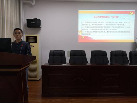 会上院党委副书记袁海山传达了校党风廉政建设宣传教育月的活动方案,带领大家集中学习《必赢3003no1线路检测中心党员领导干部“八不准”》、《 必赢3003no1线路检测中心党员职工“八不准”》、《必赢3003no1线路检测中心党员教师“六不准” 》相关条例,并为大家上了一次题为《高校教师的必修课---廉洁自律》专题党课。