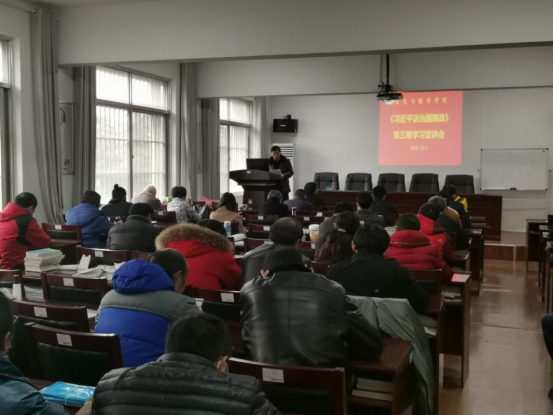 为深入学习《习近平谈治国理政》第三卷,用习近平新时代中国特色社会主义思想武装头脑、指导实践、推动工作,信数学院于12月3日下午在8教406举行了《习近平谈治国理政》第三卷学习宣讲会。校宣讲团成员、法学院副教授胡承武受邀主讲,院党委书记高迎斌主持,全院教职工参加。