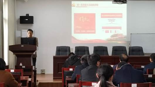 第一阶段,全体教职工集体进行政治理论学习。院长张涛带领大家一起学习了1.主题教育规定必学篇目:习近平2018年视察湖北重要讲话及“四个着力”“四个切实”重要要求;用新时代中国特色社会主义思想铸魂育人、贯彻党的教育方针落实立德树人根本任务;理直气壮开好思政课,“八个相统一”为高质量教学把脉。2.陈希:切实把党中央关于主题教育的各项要求落到实处。3.校党委书记朱业宏文章:将“改”字贯穿主题教育全过程。党委书记高迎斌通过PPt对十九届四中全会精神进行了详细宣讲。