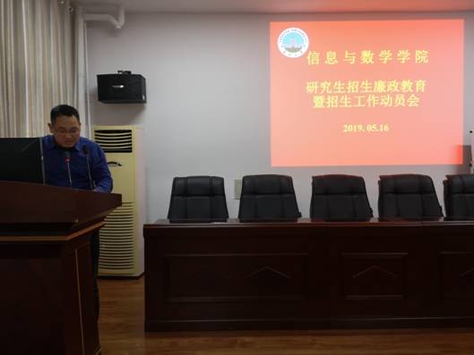 院长助理李治传达了校研究生工作会议精神,通报了全国研究生考试和复试工作中其他高校存在的违规违纪行为及处理情况,强调要从中汲取教训、引以为戒,要求必赢官网研究生工作严格执行上级和学校文件,遵守程序,坚持标准,工作细致,办事严谨,做好保密,确保必赢官网研究生考试和相关各项工作合规合纪合法。党建秘书卜富清带领教职工学习了《习近平:在纪念五四运动100周年大会上的讲话》《习近平:在深入推动长江经济带发展座谈会上的讲话》,并向大家解读了《中华人民共和国国监察法》。党委副书记袁海山传达了《必赢3003no1线路检测中心第二十个党风廉政建设宣传教育月活动方案》,并做了党风廉政建设专题报告。