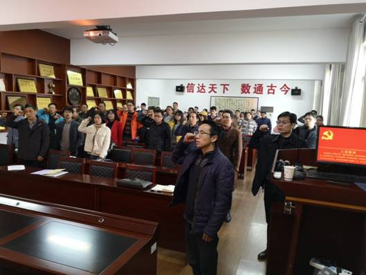 第二阶段,举行3月“支部主题党日”活动。党员全体起立,面向党旗,举起右手,在学院党委副书记袁海山领誓下,重温入党誓词。随后,以党支部为单位开展了学习讨论活动。最后党员按要求交纳了党费。