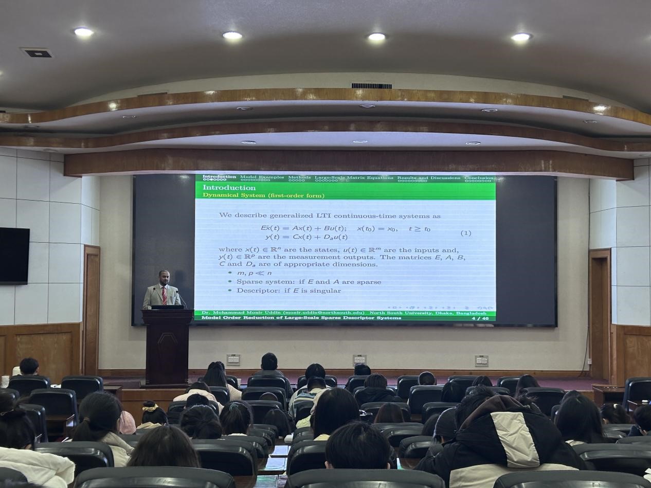 2023年12月25日,孟加拉国南北大学数学和物理系教授Mohammad Monir Uddin应邀访问必赢官网,在11教学术报告厅为学院师生作了题为“Model Order Reduction of Large- Scale Sparse Descriptor Systems(大规模稀疏描述系统的模型降阶)”的学术报告,报告由院长张涛主持。必赢3003no1线路检测中心的青年教师、研究生和本科生参加了本次学术报告会。