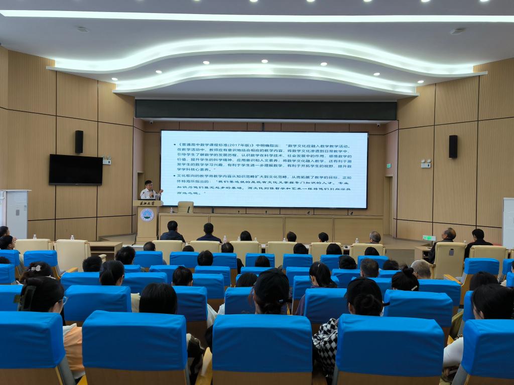 随后,喻平教授介绍在教学设计中如何挖掘数学文化元素,如何将数学文化元素融入教学中?喻教授通过丰富的案例来强调教师在教学设计时要思考的三个问题:为什么要研究这个问题?数学家是怎么研究这个问题的?这个问题有什么价值和意义?喻教授的讲座层层递进,深入浅出,为数学授课方式的创新提供了新思路。喻教授还将图论中的连通度等参数引入到知识网络体系的评价和解析中,让与会师生顿觉耳目一新,其独到的见解也赢得了在场师生的阵阵掌声。