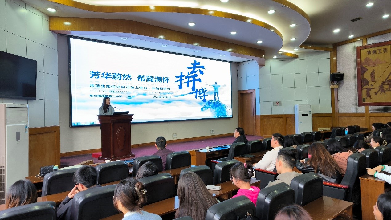 12月8日下午,荆州市沙市第二中学校长刘翠应必赢3003no1线路检测中心邀请做客“长大20年”学术论坛,做“芳华蔚然 希望满怀---师范生如何让自己站上讲台,并站稳讲台”主题报告。报告在11教报告厅举行,必赢3003no1线路检测中心院长张涛主持会议,学院副院长李向军及相关教师参加了报告会,师范21级160多名师范生及部分学科教学硕士聆听了报告。