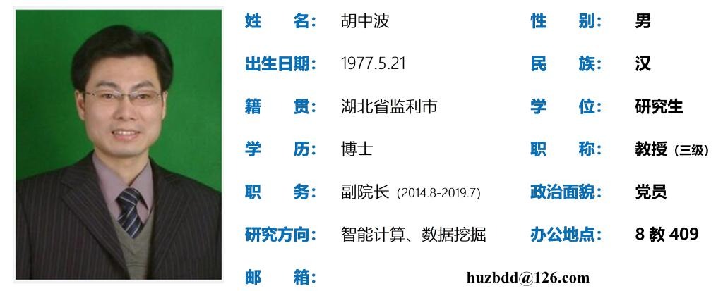胡中波,博士,教授(三级),必赢3003no1线路检测中心校聘杰出人才。主要从事智能计算、数据挖掘与统计计算研究。2013年在英国ESSEX大学数学科学学院做访问学者。主持教育部教研项目1项、省部级以上科研项目6项,以第一作者(或者通讯作者)公开发表SCI收录论文50余篇,其中包含《Swarm and evolutionary computation》、《Energy》、《Information Sciences》《Expert systems with applications》《Applied soft computing》等中国科学院文献情报中心认定的顶级期刊上论文25篇;另外,发表SSCI收录论文1篇,中文核心期刊14篇;在科学出版社出版学术专著1部,授权中国发明专利7项。