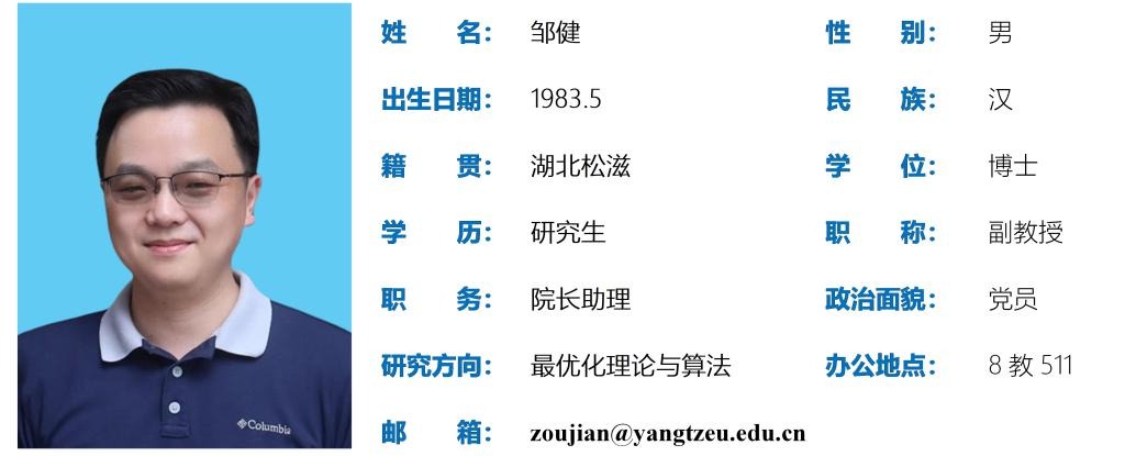 邹健,男,1983年5月出生,博士研究生,副教授。主要研究方向为最优化理论与算法、图像处理;主持完成国家自然科学基金1项;发表学术论文30余篇,其中被SCI检索20余篇;获得必赢3003no1线路检测中心教学质量优秀奖,必赢3003no1线路检测中心科研立项贡献奖,必赢3003no1线路检测中心优秀研究生导师,入选首届长江人才计划。