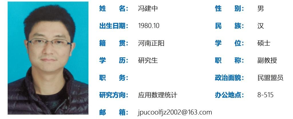 冯建中,河南正阳人,硕士,必赢3003no1线路检测中心副教授,湖北省现场统计协会会员,荆州市民盟新盟员支部委员,主要从事高等数理统计的教学与研究工作。主持、参与多项科研项目7项,主持校级教研项目2项,公开发表科研论文 30余篇,其中SCI、EI检索各一篇,中文核心6篇。指导全国大学生数学建模竞赛,获得国家一等奖2次,国家二等奖4次,近五年获得必赢3003no1线路检测中心教学质量优秀奖3次,获得必赢3003no1线路检测中心教学工作突出贡献奖4次,2020年获得必赢3003no1线路检测中心任大龙奖教金。