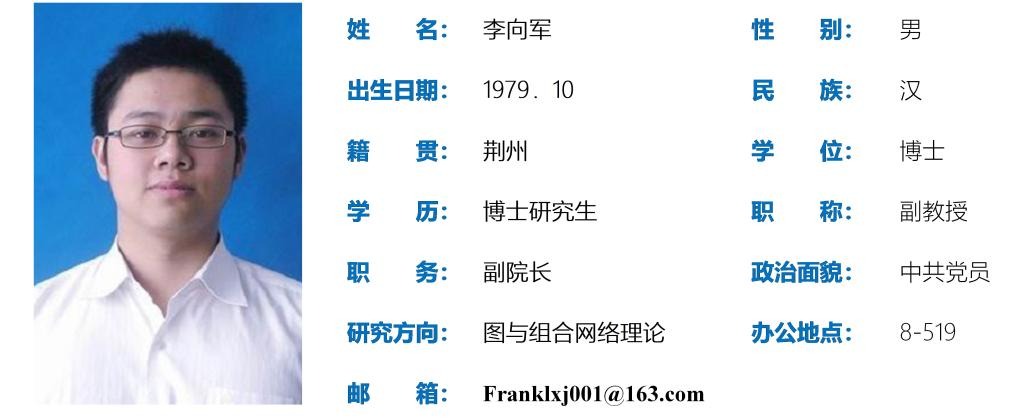 李向军,男,生于1979年10月,博士,副教授。博士毕业于中国科学技术大学,曾任美国威廉玛丽大学访问学者,主要研究方向为图与组合网络理论。主持省部级科研项目3项,参与国家自然科学基金项目3项,发表学术论文近40篇,其中以第一作者或通讯作者发表SCI 收录论文20余篇。指导学生参加全国大学生数学建模竞赛获国家级一等奖2项、二等奖10项;指导学生参加美国大学生数学建模竞赛获M奖2项,H奖8项。