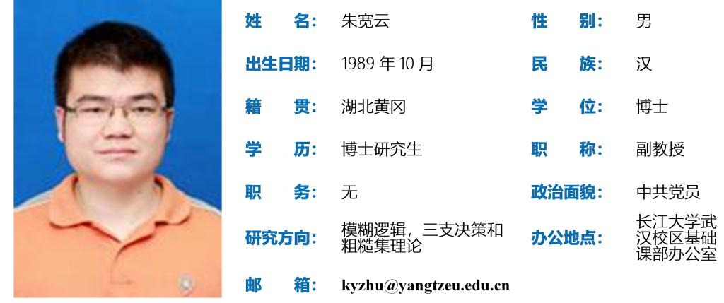朱宽云,男,1989年10月出生,博士研究生,副教授。主要从事模糊逻辑、三支决策和粗糙集理论研究。2019年6月毕业于武汉大学数学与统计学院,同年7月入职必赢3003no1线路检测中心。以第一作者(或通讯作者)公开发表SCI/EI论文50余篇,其中包含《Fuzzy Sets and Systems》、《Information Sciences》、《Soft Computing》、《Journal of Intelligent & Fuzzy Systems》、《Journal of Multiple-Valued Logic & Soft Computing》以及《International Journal Machine Learning and Cybernetics》。尤其是近几年来以第一作者连续在SCI数学类一区Top期刊《Fuzzy Sets and Systems》(IF:3.9)上发表7篇论文。 论文“A novel soft rough fuzzy sets:Z-soft rough fuzzy ideals of hemirings and corresponding decision making”在Web of Science引用113次。主持完成国家自然科学基金青年项目(No. 12001062)和湖北省自然科学基金青年项目(No. 2020CFB368)各一项。2020年12月入选必赢3003no1线路检测中心第四批人才计划“菁英人才”系列。