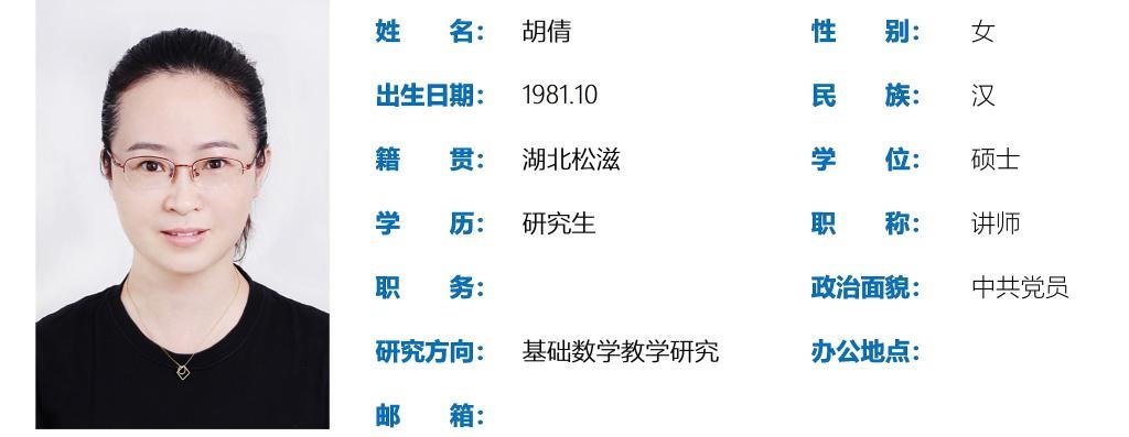 胡倩,女,1981年10月出生,硕士研究生,讲师。主要从事高等数学教学研究,曾获必赢3003no1线路检测中心第二届青年教师讲课比赛一等奖,湖北省第六届高校青年教师教学竞赛理科组三等奖,必赢3003no1线路检测中心第八届教学工作突出贡献二等奖,荣获2018-2019学年“任大龙奖教金”,多次荣获必赢3003no1线路检测中心教学优质奖。