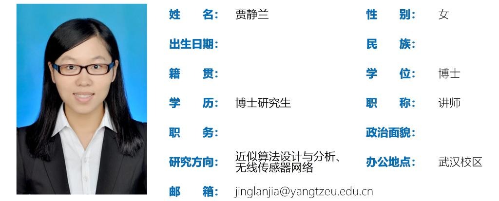 贾静兰,女,博士,讲师,主要研究方向为近似算法设计与分析、无线传感器网络。主持湖北省教育厅科学技术研究计划指导性项目1项;发表学术论文5篇;获得必赢3003no1线路检测中心教学质量优秀奖1项。